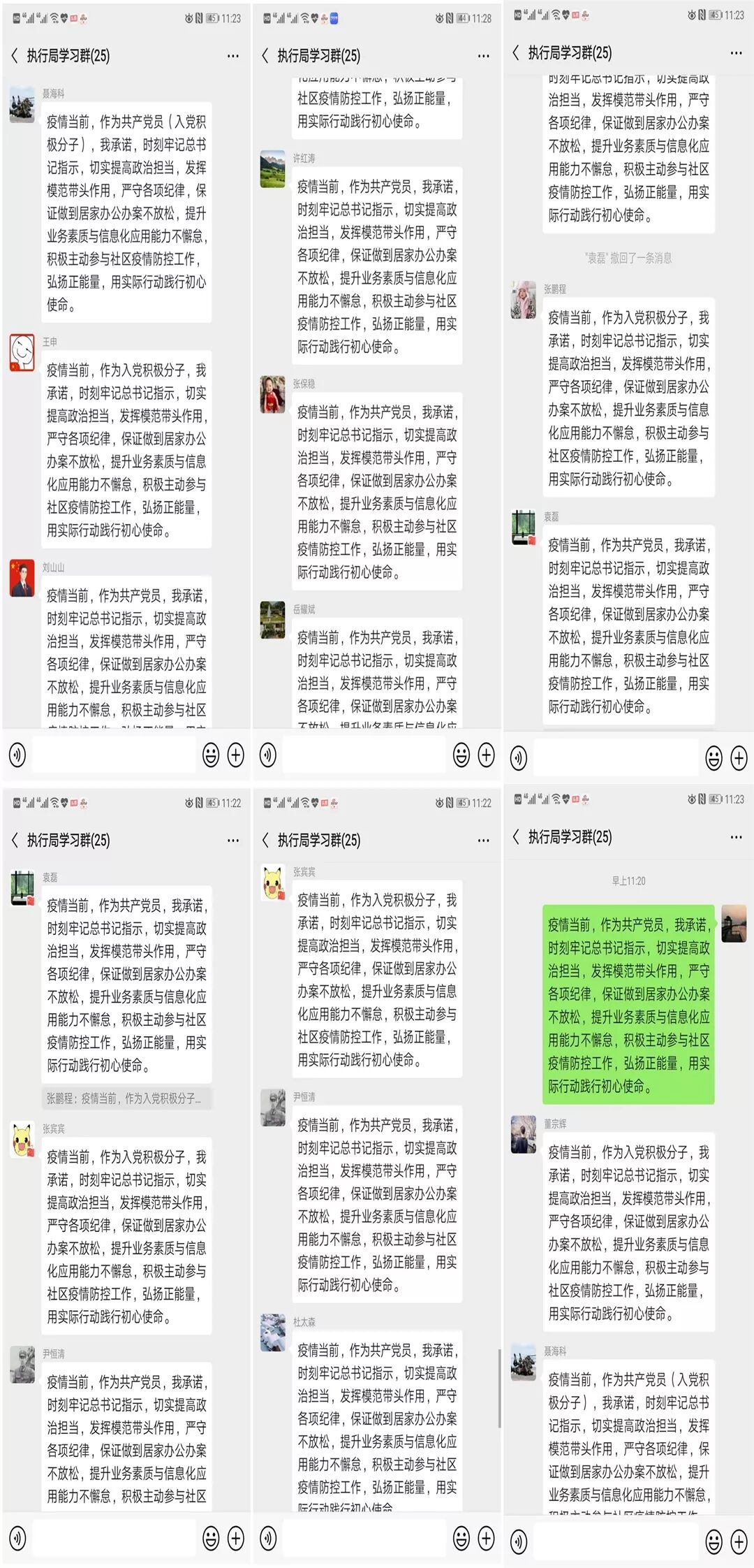 活动中,张昌全同志宣布濮阳中院疫情期间执行局临时党支部成立。文艺同志、尹恒青同志分别传达学习了《濮阳市中级人民法院新型冠状病毒感染的肺炎疫情应对实施方案(第二版)》和《濮阳市中级人民法院关于切实做好新冠肺炎疫情防控期间执行工作的意见》。张保稳同志和坚守工作岗位以及参与社区疫情防控的优秀年轻党员、入党积极分子代表对共产党员如何面对困难和挑战以及近期工作情况,同大家进行交流。执行局负责人袁磊同志对党员在疫情期间如何发挥模范先锋作用提出具体要求。
