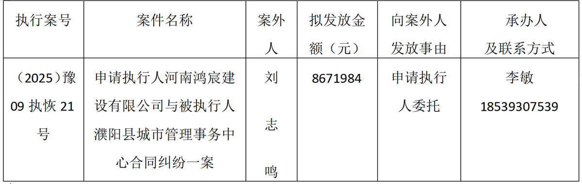 濮阳市中级人民法院关于向案外人发放执行案款的公示