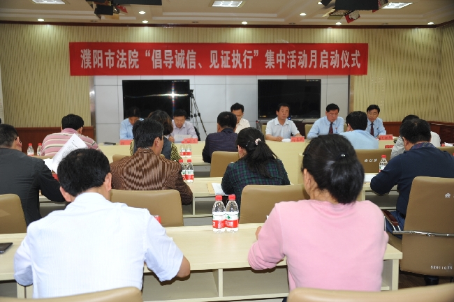 根据河南省高级人民法院的统一部署,濮阳中院于5月7日10点在审判庭举行了“倡导诚信、见证执行”集中活动月启动仪式。出席启动仪式的有:市委政法委赵建刚副书记,市人大常委会法制工作委员会孙喜民主任,市政协社会和法制委员会李普生主任,市中院党组成员、副院长井云亮,人大代表、政协委员、市检察院、市公安局、市住房和城乡建设局、市工商局、各银行、执行监督员,基层组织代表、律师代表、群众代表、新闻媒体记者,中院各部门负责人及执行局全体人员、各县区法院执行局长等共计50余人。仪式由中院党组成员、执行局长郭邑主持。中院井云亮副院长致词。中院执行局王相锋副局长宣读了《关于公布“濮阳市军涛物资印刷有限公司”等20名失信被执行人名单的决定》。