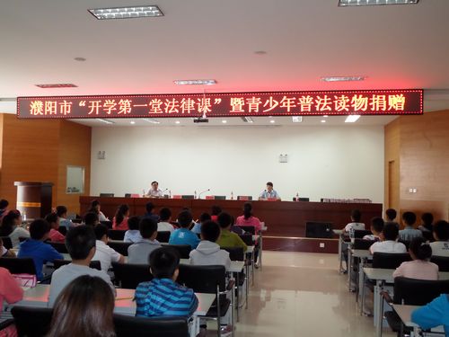 9月13日上午,濮阳中院开展的“2013年秋季开学第一堂法律课”暨《成长路上,我们与法同行》普法漫画口袋书赠书仪式,会场在濮阳市实验中学举行,该中学300余名入学新生参加活动。濮阳中院副院长井云亮现场向新生赠书。濮阳中院的法官用通俗易懂的语言以案说法,以发生在身边的真实案例分析了青少年违法犯罪的特点和原因,讲述了未成年人犯罪的防治对策。此外,团市委的领导也在会上就青少年如何才能更好地“与法同行,安全成长”等法制教育问题进行了发言,分析问题,研究对策,制订措施,共同助力青少年健康成长。井院长表示,濮阳中院将本着一份强烈的社会担当,去关注每一名青少年的健康成长,希望同学们树立“法律是最低限度的道德”这个底线和原则,增强法律意识,提高自我防范意识,学会对自己负责、对家人负责、对社会负责,认真走好人生每一步,做一个对社会有用的人。