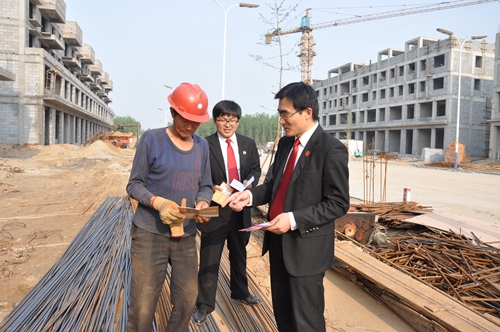 在厂区,法官们与民工们进行了详细交谈,了解他们的工资水平,询问工资发放是否及时,调查他们的维权途径等,接受农民工们的法律咨询,并向他们传达了省高院第六次“拖欠农民工工资案件集中办理”活动的会议精神,为他们带去了《农民工工资维权必备知识手册》,现场进行普法教育。