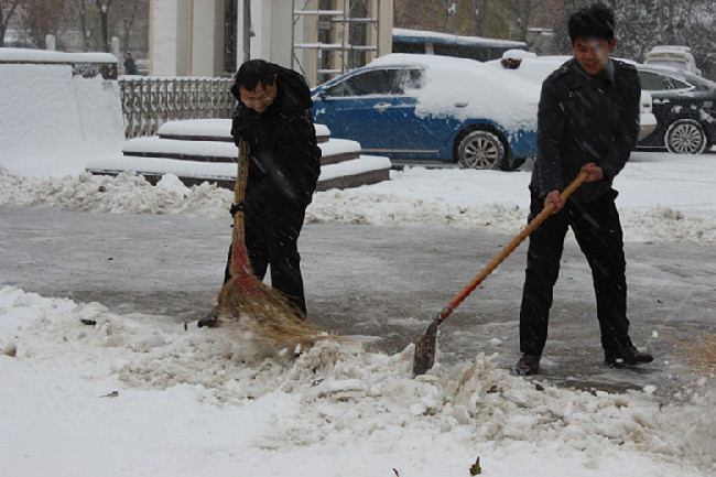 11月23日下午,范县天气骤变,漫天大雪纷纷而至。24日清晨大雪仍不停息,地上已经积了厚厚的一层雪,为保证审判工作的正常进行,方便当事人诉讼,范县人民法院院长韩军不惧严寒,率先垂范带领干警清扫院内积雪。