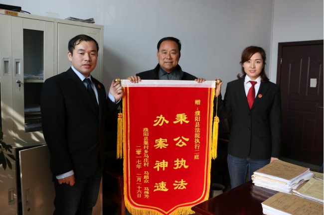 2月16日上午,申请人马某专程来到濮阳县法院,把一面印有“秉公执法、办案神速”的锦旗送到该院执行二庭的法官手中,感谢他们能如此迅速地将自己被扣押三年多的车返还给自己。